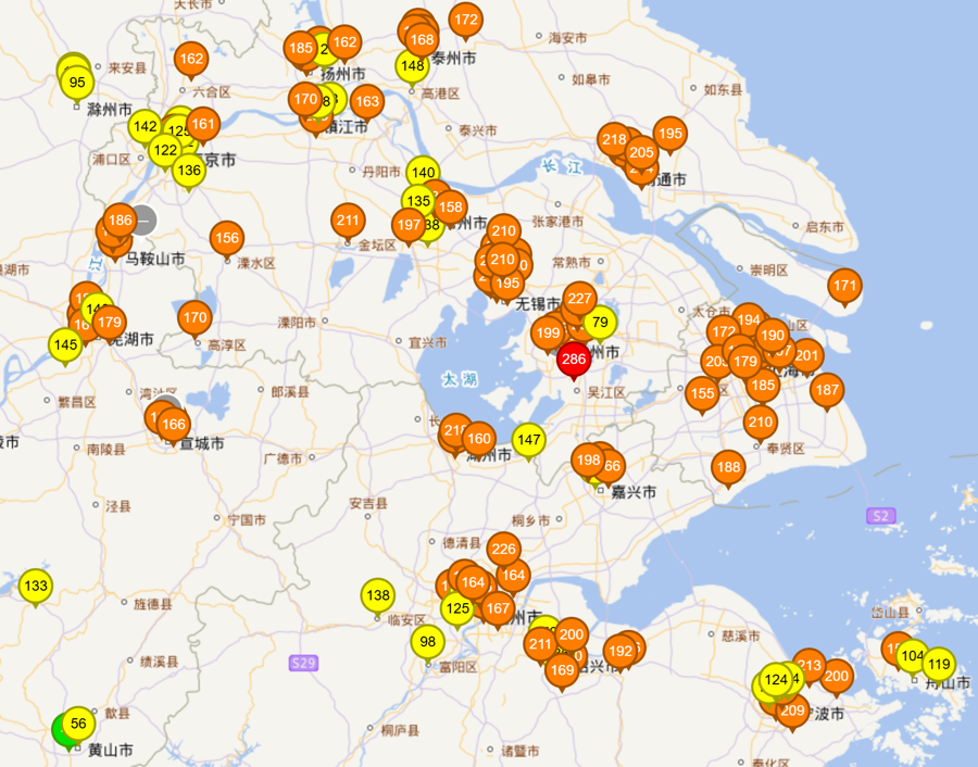 11月25日8时,上海及周边区域PM10实时数据。 来源:全国城市空气质量实时发布平台